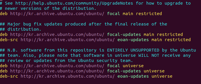 19.10버전이 eoan ermine이고, 20.04가 focal Fossa입니다. 위 사진을 보면 두 버전이 섞여 있는 것을 볼 수 있는데 이거 통일해주셔야합니다. (중간중간 에러가 뜰경우 말이죠!)