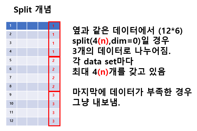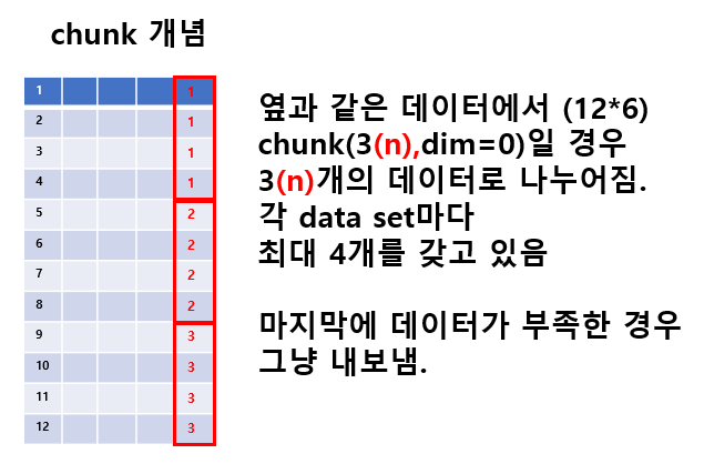 아 split이나 chunk에서 dim의 경우 0=1차원, 1=2차원, 2=3차원입니다. (추가)