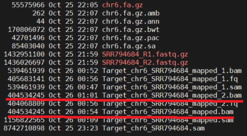 bwa-0.7.17 mem chr6.fa.gz SRR794684_R1.fastq.gz SRR794684_R2.fastq.gz -o Target_chr6_SRR794684.sam