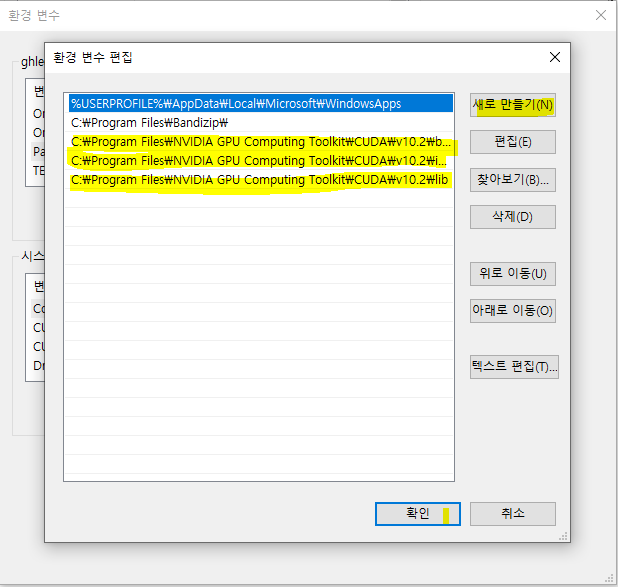 새로만들기 하시고 CUDA 폴더에서 bin, include, lib 세가지의 path를 추가해주시면 됩니다.