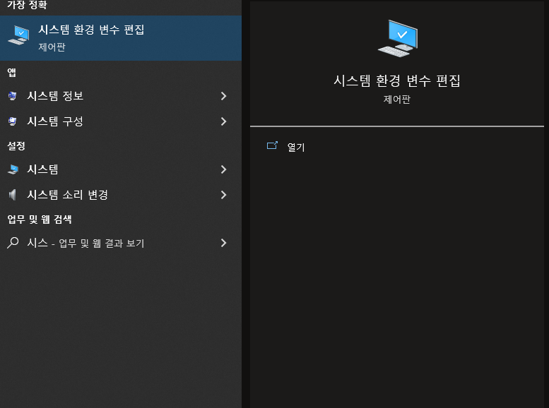 그리고 환경변수를 변경해야 하는데 윈도우 누르고 "시스템 환경 변수 편집" 을 찾습니다.