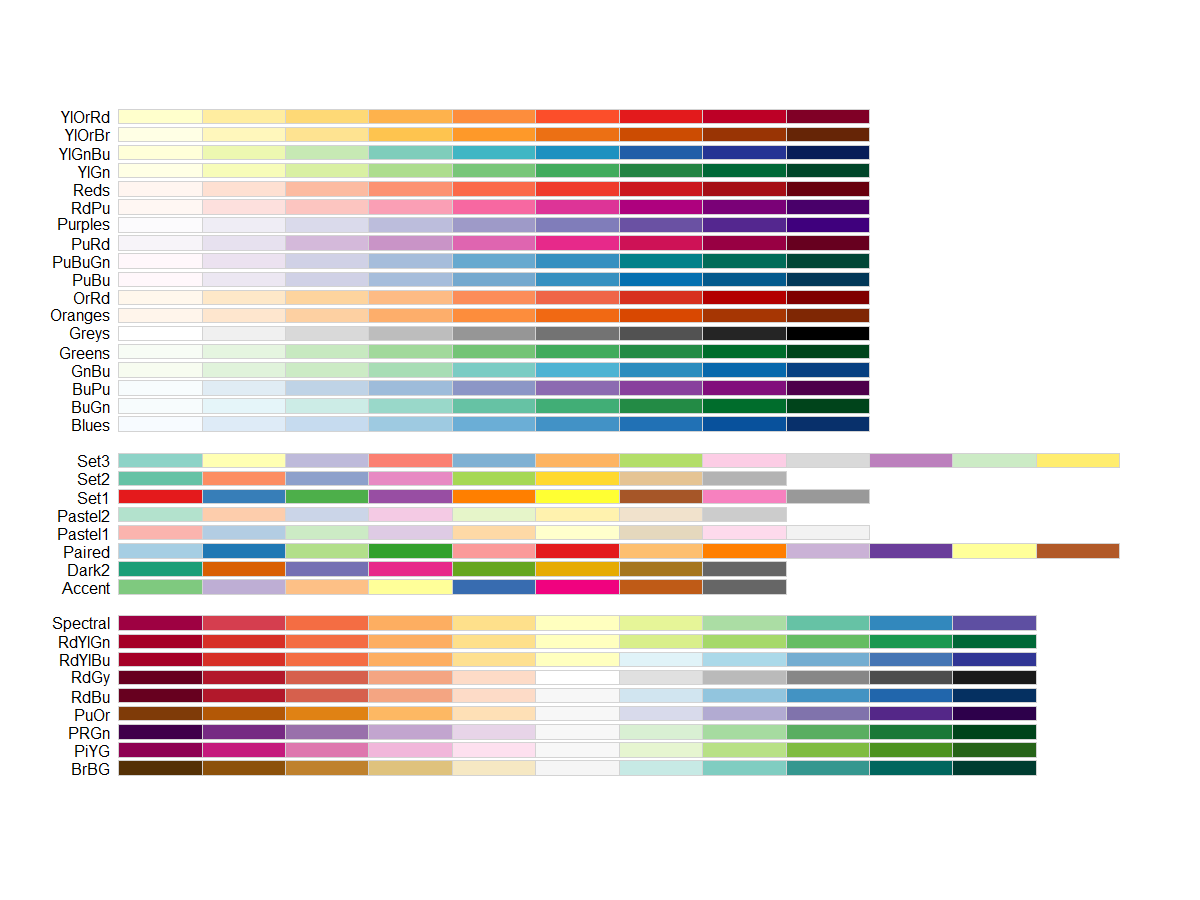 다음과 같이 추천해주는 색감들을 확인해보니 다음과 같습니다. (display.brewer.all function의 help에 예시를 보면 다양하게 색을 확인할수가 있습니다.)