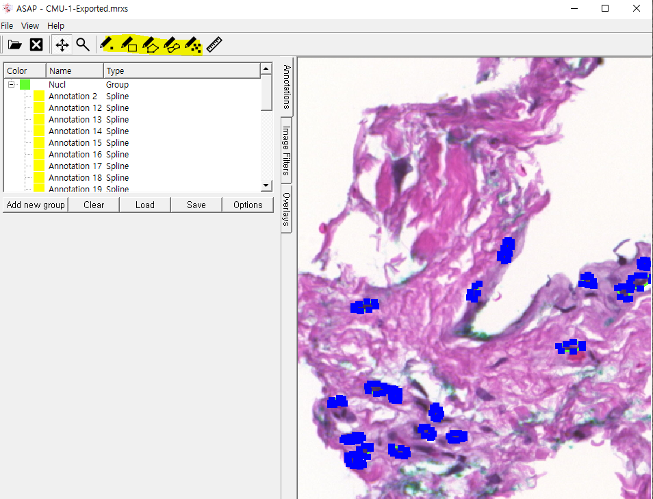 위와 같이 열리면 성공입니다. 그리고 열어서 아래 그림에 형광펜으로 표시된 tools 부분을 이용하여 annotation을 시킵니다. (병리과 의사들의 경우 annotation을 전체적으로 하지 않고, 부분적으로만 표시해줍니다, 아마 진단시에도 부분적으로 보고 판단하는듯 합니다. 슬라이드 전체를 보고 진단하기에는 인력낭비가 심할듯하구요.. 뇌피셜..)