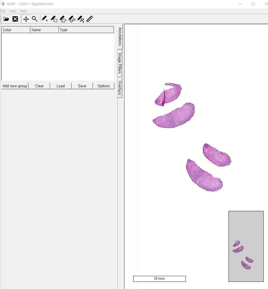 병리과 의사들이 H&E 슬라이드를 보고 annotation을 진행하게 되는데, 그럴때 사용하는 프로그램중 하나가 ASAP라는 tool입니다. (ASAP는 tool중 하나일뿐 다양한 tool이 존재합니다.)