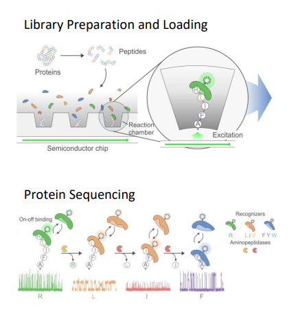 그림으로 추측을 해보자면 어떠한 분자들(Recognizers)이 있는데, 이 분자들은 특정 펩타이드와 결합하면서 색을 내는 것 같습니다. 그래서 loading 되어있는 펩타이드에 이 분자(Recognizers)들이 붙어 표시하고, Aminopeptidases를 이용하여 읽힌 peptide를 제거하고, 다음 분자(Recognizers)가 붙어서 확인하고, 또 Aminopeptideases를 이용하여 제거하고 이런식으로 반복하면서 해당 peptide가 무엇인지 알수 있게 만든 것 같습니다(Aminopeptideases이 부분 또한 QSI에서 갖고 있는 특징인 것 같습니다.).