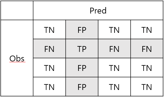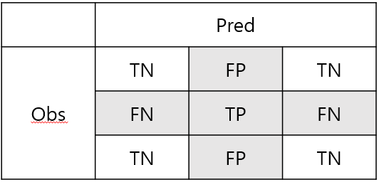 위와 같은 Multi class에서 TN, TP, FP, FN을 어떻게 생각해야되는지 그림을 통해 그려보았습니다.