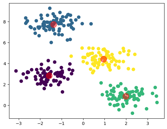 plt.scatter(centers[:, 0], centers[:, 1], c='red', s=200, alpha=0.5)
