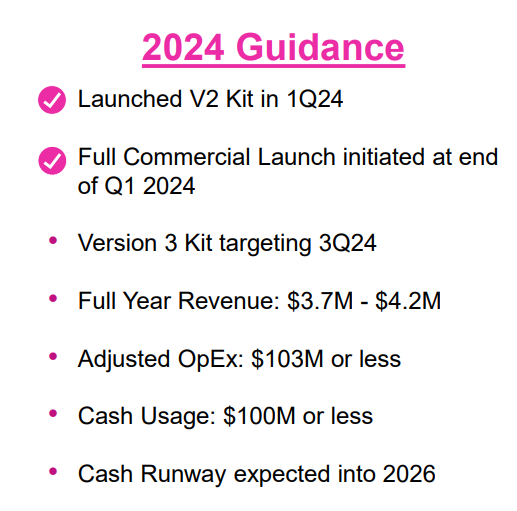 마지막으로 중요한 것은 QSI가 Full Commercial을 했다는 것입니다. 그런데 가이던스를 보니, 생각 외로 낮은 수익을 예상하고 있었습니다. 작년에 1.1M정도를 했고, 2024년 예상을 3.7~4.2M이라고 예상한다고 적어놨는데, 제 생각에는 일단 서비스하는 곳이 제한되어있는 점(독일,영국 등 유럽일부 국가, 일본, 미국만 서비스가능), 그리고 Full Commercial 초기이기 때문에 2025년까지 기다려 보는것도 좋다고 생각이 들었습니다(사실 1.1M -> 3.7M 으로 300% 수익이 늘어나는거면 많이 올라가는게 아닐까 싶습니다.)