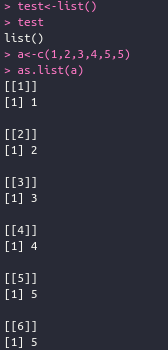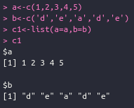특정 벡터값들을 as.list()로 list로 변환시켜보면 다음과 같이 만들어지는데, 값들이 어디로 들어갔는지 모를수 있으니 문자로도 만들어 보겠습니다.