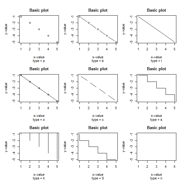 > plot(x=x,y=y,type='c',main='Basic plot',xlab='x-value',ylab='y-value',sub = 'type = c')