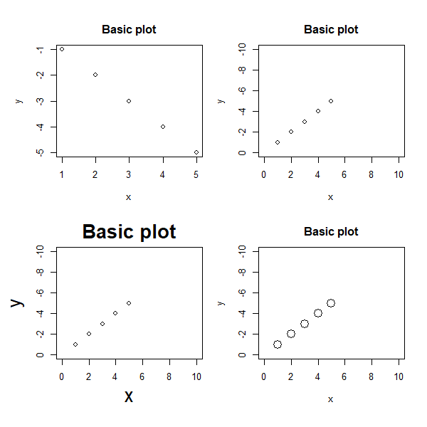 > plot(x,y,xlim = c(0,10),ylim = c(0,-10),main='Basic plot',cex.main=2,cex.lab=2)