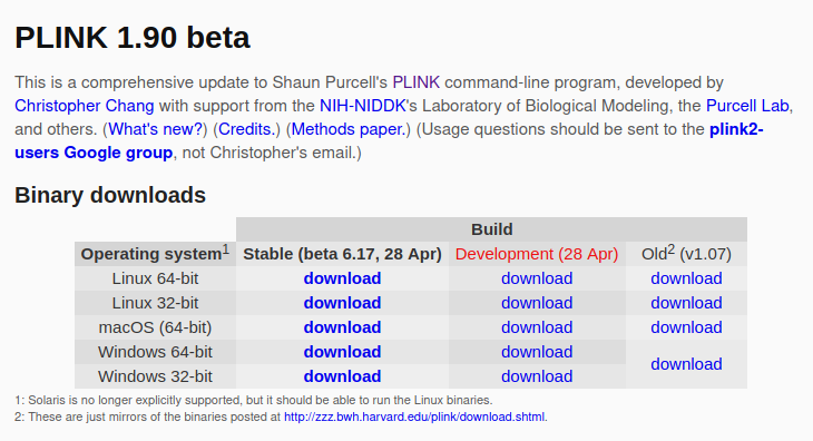 1: Solaris is no longer explicitly supported, but it should be able to run the Linux binaries. 2: These are just mirrors of the binaries posted at http://zzz.bwh.harvard.edu/plink/download.shtml. Continue using PLINK 1.07 for most of these operations. Howe