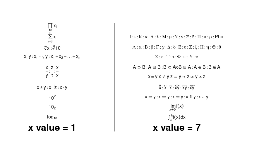 text(7,4,expression(hat(x):tilde(x):bar(x):widehat(xy):bar(xy):widetilde(xy)))