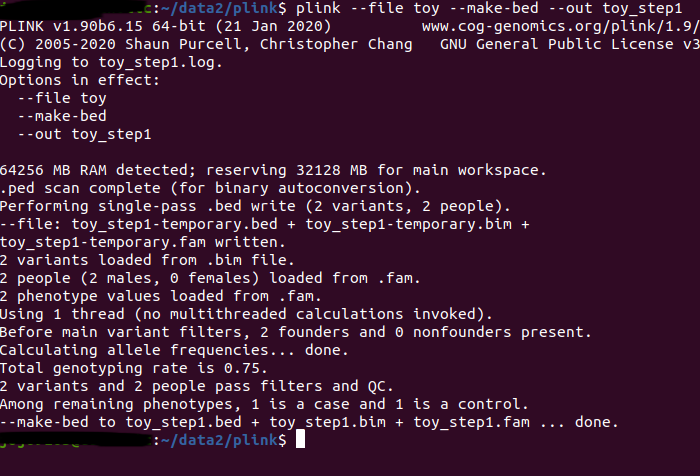 그러면 그 폴더 내에 toy_step1.bim, .bed, .fam이 생기게 됩니다.