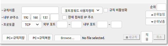 고급설정 ->NAT/라우터 관리 -> 포트포워드 설정 들어가서